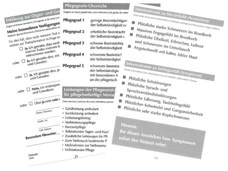 Erklärung zur Organ- und Gewebespende, Pflegegrade-Übersicht sowie Informationen Herzinfarkt (Anzeichen) und Schlaganfall (Symptomen)